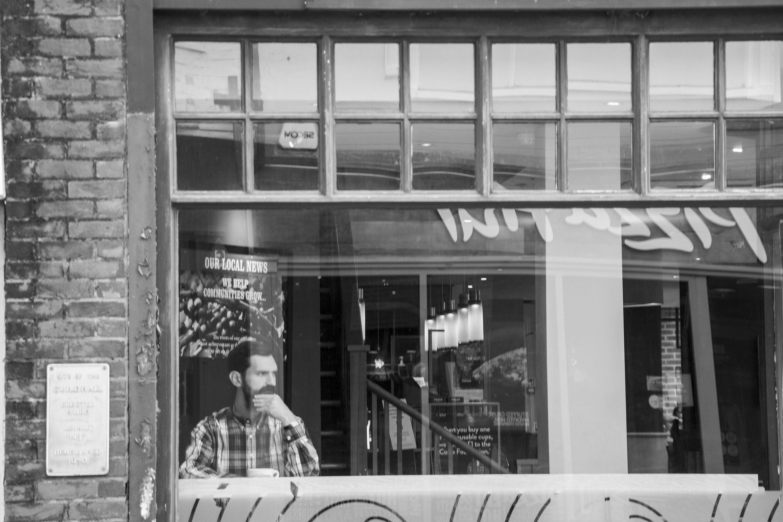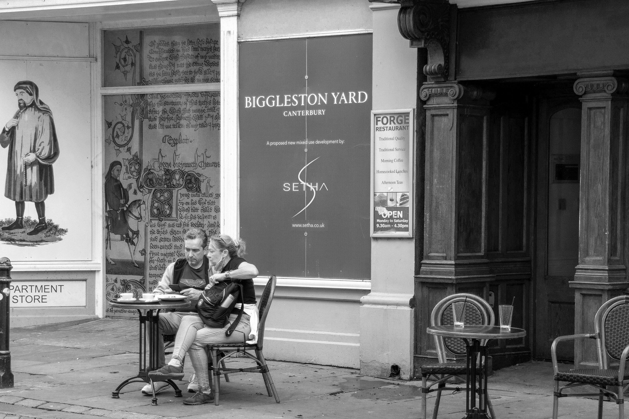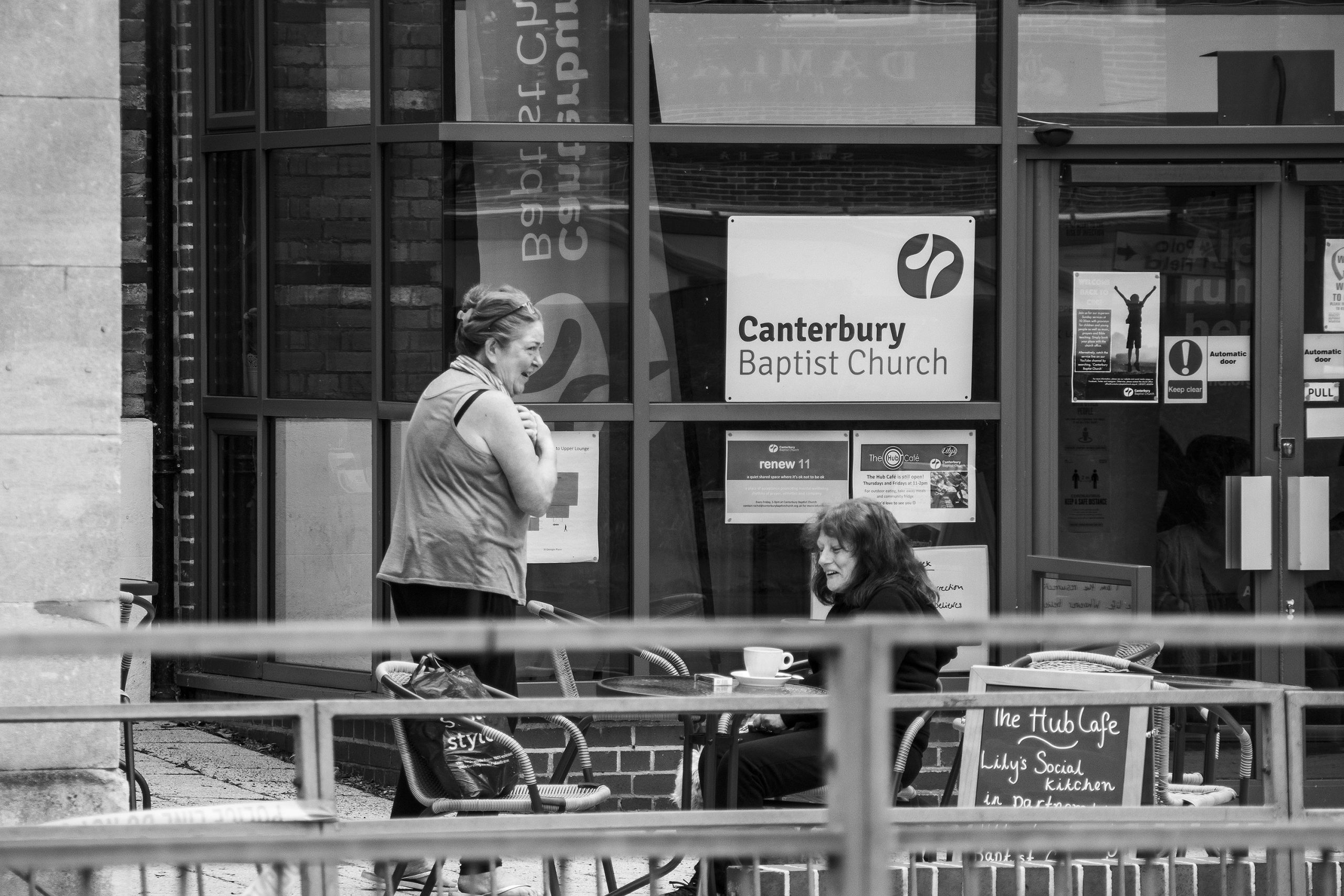 Canterbury Streets. These are images taken over several years. They use the medium of monochrome to see the sights of the city with a different aesthetic. Some might say that the use of black and white is a step away from faithfully representing a scene. But alternatively monochrome could be more accurate by focussing the viewer on highlights and contrasts with less ‘noise’. Canterbury is a historical city and tourist destination. These photos draw attention more to empty streets, reflections in the rain and incidental scenes of meetings. In most tourist promotional photos there are sun bathed scenes of pleasure and desire. The aesthetic here is cooler and more everyday while also asking us to look again at the familiar.